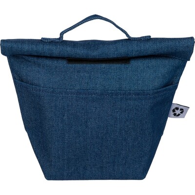 Torba termoizolacyjna o pojemności ok. 8 litrów, krótki uchwyt do noszenia, kieszeń z przodu, zapięcie na rzep, PEVA w środku, ikona recyklingu, produkt wykonany z denimu z recyklingu