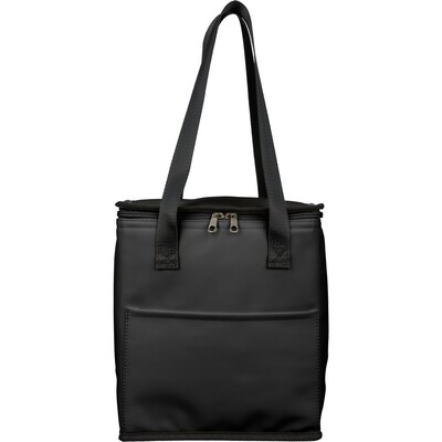 Torba termoizolacyjna o pojemności 9 litrów, posiada długie uchwyty do noszenia na ramieniu (2,5 × 66 cm), kieszeń przednia, ikona recyklingu na metce, produkt wykonany z PU z recyklingu z poliestrową podszewką