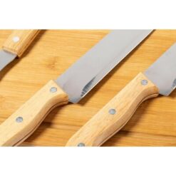 Zestaw do grilla, 6 elementów: 2 noże, ostrzałka, widelec oraz szczypce z drewnianymi rączkami, bambusowa deska do krojenia, pokrowiec w komplecie