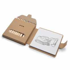Zestaw do kolorowania, zawiera 12 drewnianych kredek ołówkowych oraz 40 kolorowanek w opakowaniu wykonanym z kartonu kraftowego, kredki są zabezpieczone wbudowanym kartonowym etui