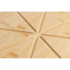 Zestaw do serwowania pizzy, deska do krojenia pizzy ze sznurkową zawieszką i wcięciami ułatwiającymi serwowanie, nóż do pizzy i łopatka w komplecie, zapakowany w brązowe kartonowe pudełko produkt wykonany z bambusa i metalu