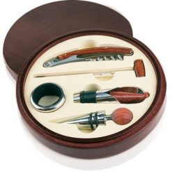 Zestaw do wina 5 el. w drewnianym pudełku, nóż kelnerski, pierścień, zatyczka, nalewak z zamknięciem i termometr