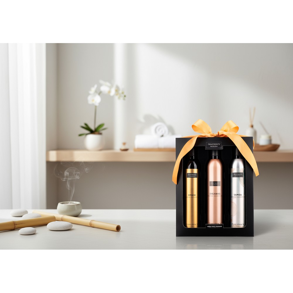 Zestaw kosmetyków Foaming Extravagance TREATMENTS, przeznaczony dla kobiet i mężczyzn, w zestawie znajdują się 3 pieniące się żele pod prysznic 200 ml, różne zapachy: 08 – Omani (oddaje klimat Omanu – jego plaż, bezkresnych pustyń oraz drzewa sandałowego), 16 – Zhejiang (połączenie zapachu kaszmeranu z wanilią bourbon i jaśminem), 98 – Samoa (rajski zapach Samoa wzbogacony słodkim piżmem), sprawdzą się w codziennej pielęgnacji, żele zapakowane są elegancki kartonik. Znakowanie produktu jest możliwe tylko na srebrnej lub złotej folii z czarnym nadrukiem albo na czarnej apli ze srebrnym lub złotym nadrukiem.