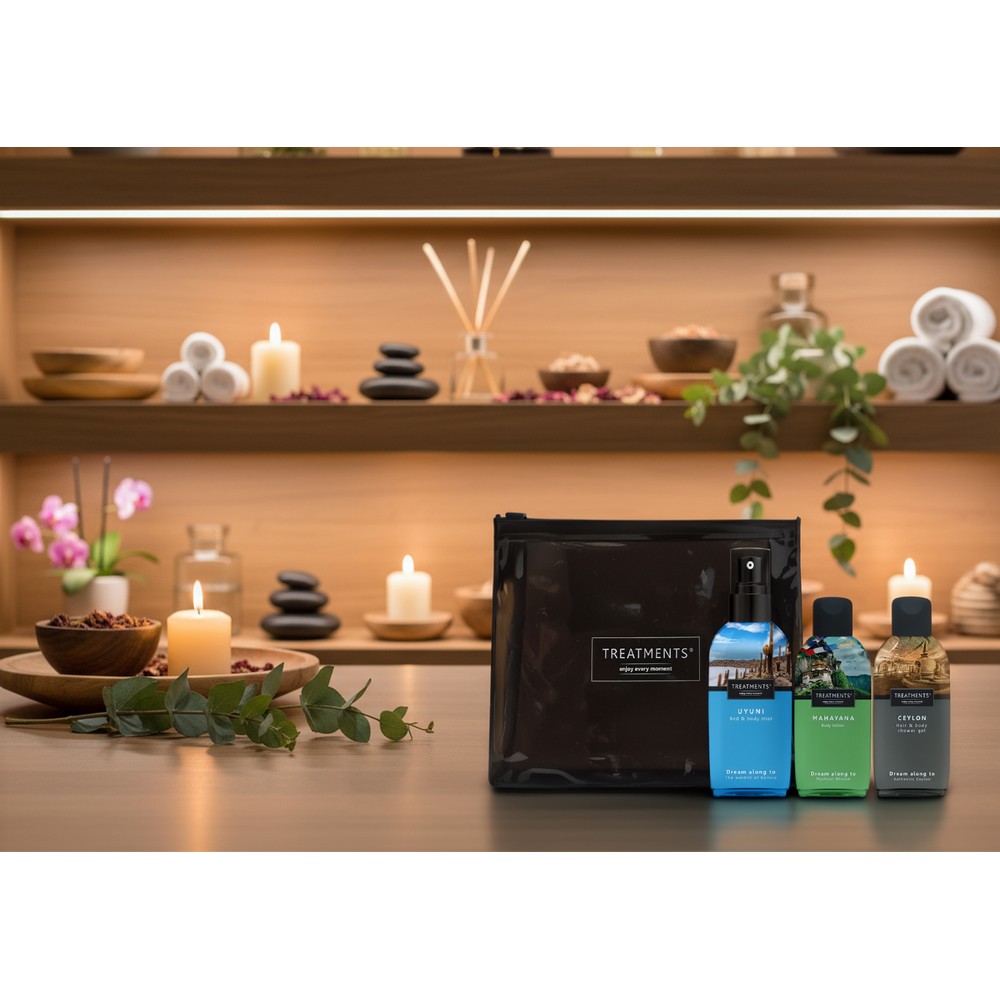Zestaw kosmetyków podróżnych TREATMENTS, przeznaczony dla kobiet i mężczyzn, w zestawie znajduje się: mgiełka do ciała i pościeli Uyuni (lawenda, irys i drzewne nuty, które przenoszą w atmosferę Salar de Uyuni), 50 ml, balsam do ciała Mahayana (aromat hiacyntów oraz korzenne nuty piżma i drzewa sandałowego) 50 ml, żel pod prysznic do włosów i ciała 50 ml, Ceylon (połączenie zapachów starożytnego Cejlonu z kwiatem owoców i jaśminem), 50 ml, elegancka kosmetyczka, do której zapakowane są kosmetyki, sprawdzą się w codziennej pielęgnacji