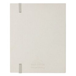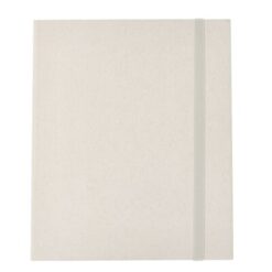 Zestaw 6 kredek, gumka do ścierania, notatnik z 50 pustymi kartkami, dodatkowe zamknięcie w postaci dopasowanej kolorystycznie elastycznej opaski, ikona zrecyklingowanych kartoników po mleku na produkcie, produkt wykonany ze zrecyklingowanych kartoników po mleku