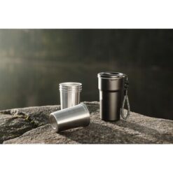 Zestaw kubków podróżnych 5 w 1, w komplecie kubek 450 ml oraz cztery kubki 250 ml, które mieszczą się wewnątrz dużego kubka, duży kubek posiada odpinany pasek do noszenia, wykonane ze stali nierdzewnej z recyklingu, całkowita zawartość materiałów z recyklingu obliczona na podstawie masy całkowitej produktu: 71%