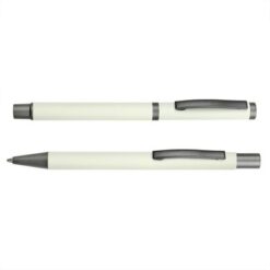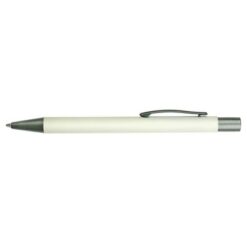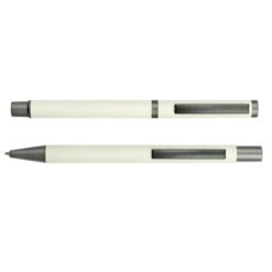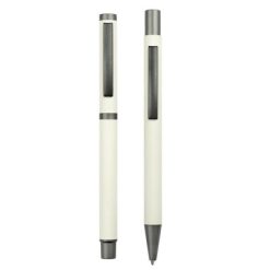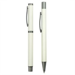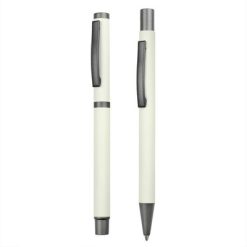Zestaw piśmienniczy, długopis oraz pióro kulkowe z kolorowym trzonem i szarymi elementami, długopis klikany, piórko kulkowe ze skuwką, posiadają gumowe wykończenie, wkłady w niebieskim kolorze, dopasowane kolorystycznie pudełko podarunkowe w komplecie, produkt wykonany z aluminium i plastiku