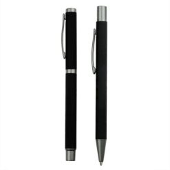 Zestaw piśmienniczy, długopis oraz pióro kulkowe z kolorowym trzonem i szarymi elementami, długopis klikany, piórko kulkowe ze skuwką, posiadają gumowe wykończenie, wkłady w niebieskim kolorze, dopasowane kolorystycznie pudełko podarunkowe w komplecie, produkt wykonany z aluminium i plastiku