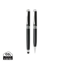 Ekskluzywny zestaw piśmienny, wykonane z mosiądzu pióro kulkowe z touch penem oraz długopis z logotypem Swiss Peak, niebieski wkład, pokrowiec PU oraz pudełko podarunkowe w komplecie, ślad węglowy produktu: 0,54 kg CO2
