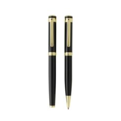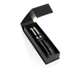 Ekskluzywny zestaw piśmienny, pióro żelowe oraz długopis z logotypem Swiss Peak wykonane z mosiądzu z recyklingu z certyfikatem RCS, akcenty w kolorze złotym, niebieski wkład, długość pisania długopisu ok. 1200 m, długość pisania pióra ok. 800 m, pudełko podarunkowe w komplecie, całkowita zawartość materiałów z recyklingu obliczona w oparciu o wagę całkowitą przedmiotu: 55%