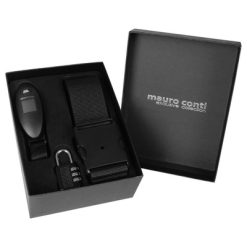 Zestaw podróżny Mauro Conti, wewnątrz cyfrowa waga do bagażu z przyciskiem on/off i paskiem na rękę (maksymalne obciążenie 40 kg, minimalne 1 kg), pas do walizki oraz kłódka podróżna, w ozdobnym pudełku