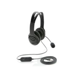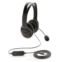 Zestaw słuchawkowy, wykonany z ABS, lekki i wygodny, wbudowany mikrofon, wbudowany panel do zmiany głośności / wyciszenia, nadają się idealnie do rozmów video, kompatybilne z komputerami PC oraz Mac®, zintegrowany kabel z końcówką USB A o długości 2 m, ślad węglowy produktu: 1,37 kg CO2