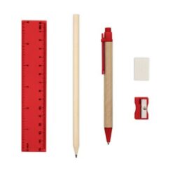 Zestaw szkolny, piórnik, ołówek, długopis, linijka, gumka i temperówka | Tobias z nadrukiem Twojego logo, materiał: karton, kolor: czerwony