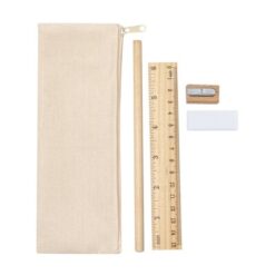 Zestaw szkolny, linijka, ołówek, gumka i temperówka, piórnik zamykany na zamek z bawełny z recyklingu