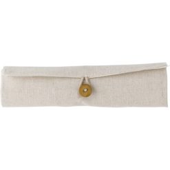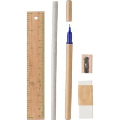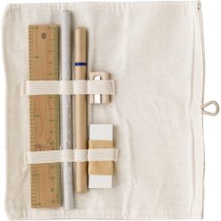 Zestaw szkolny w bawełnianym etui, ołówek, długopis, temperówka, gumka do mazania i bambusowa linijka 15 cm