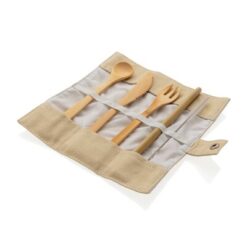 Zestaw 4 bambusowych sztućców wielokrotnego użytku: łyżka, widelec, nóż, słomka, materiałowy pokrowiec i czyścik w komplecie, ślad węglowy produktu: 0,61 kg CO2