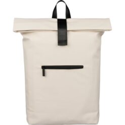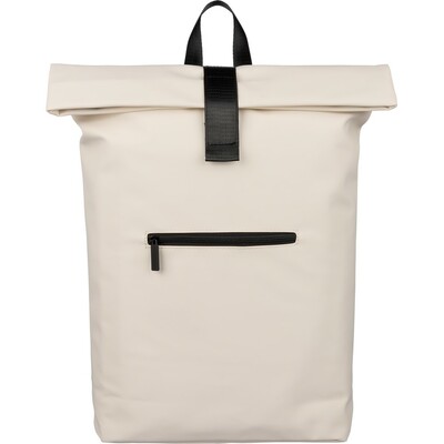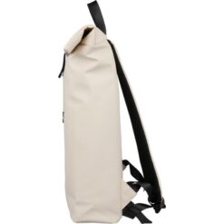 Zwijany plecak o pojemności 19 litrów, mała kieszeń zapinana na zamek z przodu, zwijana główna kieszeń zamykana na rzep, przegroda na laptopa 16″ w środku, regulowane wentylowane paski na ramię, uchwyt z wierzchu ułatwiający noszenie, podszewka z poliestru 210D, ikona recyklingu na metce, produkt wykonany z PU z recyklingu i poliestru